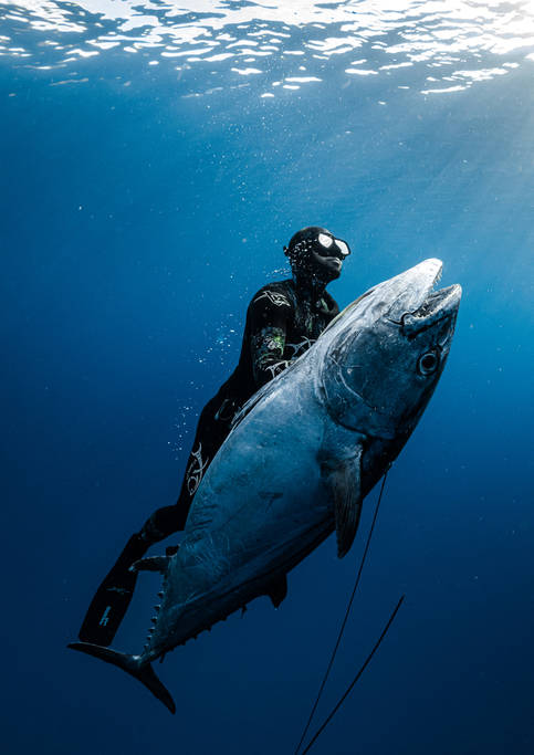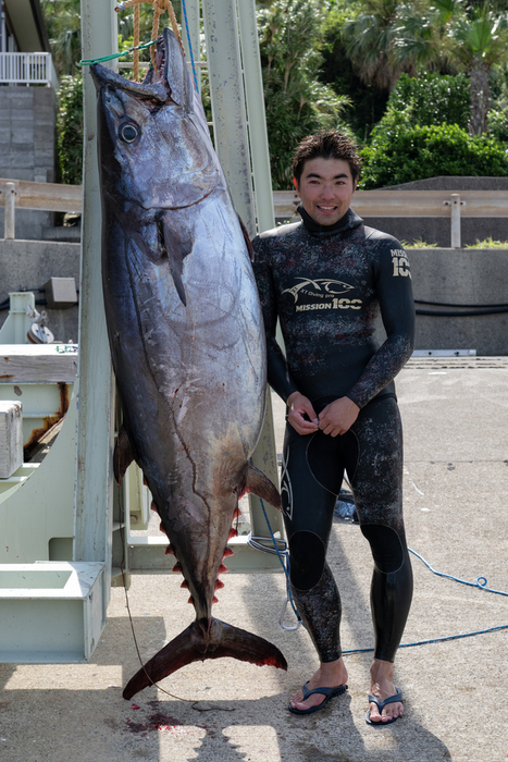 2021年からは毎年2カ月間、イソマグロを狙い遠征を続けてきました。2025年5月に遠征先として向かった南西諸島で、最終日に全長198センチメートル、重さ105.5キログラムのイソマグロを手銛で仕留め、10年越しの挑戦で新たな金字塔を打ち立てました。