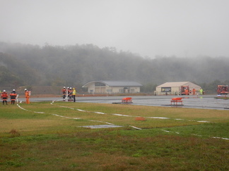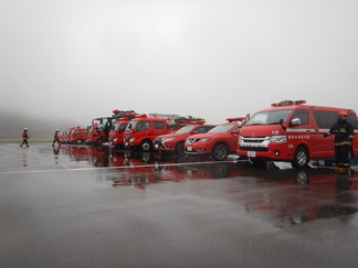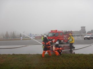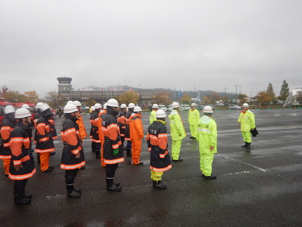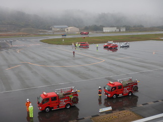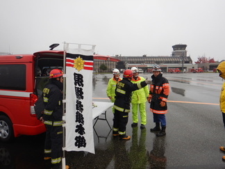 当日は雨が降る中、航空機事故で火災が起こったとの想定で避難誘導や消火活動などを実施しました。