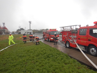 豊岡消防団は、団員25人、消防ポンプ自動車4台が参加し、刻々と変化する火災状況の中、滑走路内の貯水槽から中継送水を行い、迅速な消火活動を実施しました。