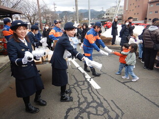 豊岡消防団と豊岡消防保安協会の合同で防災啓発グッズを配布し、子どもたちなど多くの市民の方に受け取っていただきました。