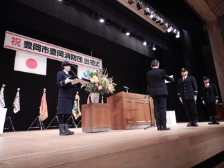 豊岡市民会館文化ホールで開催した式典では、門間市長による式辞、中村消防団長による訓示に加え、日頃の活動の功績が認められた団員に対する表彰などを行いました。表彰では、兵庫県知事表彰のほか、日本消防協会長表彰、兵庫県消防協会長表彰の伝達、市長表彰、団長表彰、献血功労団体表彰の贈呈を行いました。