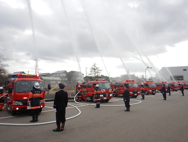 式典後は、市営中央駐車場へ移動し「観閲」と「分列行進」、豊岡消防団と豊岡消防署のポンプ車15台、はしご車1台による「一斉放水」を行い、 多くの来場者が見守る中、盛大に実施することが出来ました。
