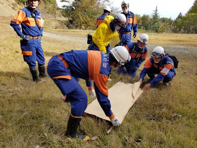 日高分署員のアドバイスの下、毛布を利用した簡易担架の作成や要救助者の搬送方法について学び、捜索時の必要な知識の習得や技術向上が図られ、団員の意識を高める有意義な訓練になりました。