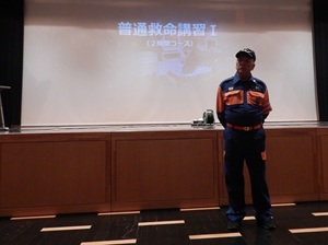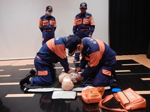 団員らは、心肺蘇生法やAED(自動体外式除細動器)の使用法、窒息者を発見した場合の対応などを受講するとともに、4班に分かれて訓練人形による呼吸確認や胸骨圧迫、AED操作などを体験。最後には、倒れた人を発見した場合に救急隊が到着するまでを想定し、心肺蘇生法を行う団員を交代させる心肺蘇生法のリレーを訓練しました。