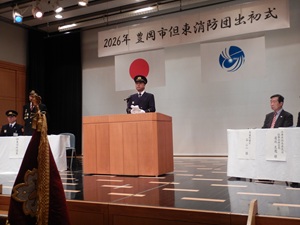 2026年1月11日、但東市民センターおよび但東庁舎前駐車場で、豊岡市但東消防団(団長:宮垣博文)が2026年出初式を実施しました。