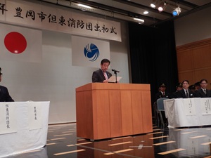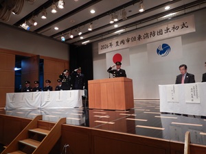 式典では、市長式辞の他、表彰状伝達、授与、来賓祝辞などが行われました。団長からは団員に「有事の際には、分団長の指揮に従い、団員の団結と連携をもって、市民の生命・身体・財産を守る最後の砦となっていただくことを期待する」と訓示がありました。