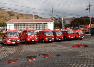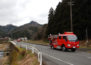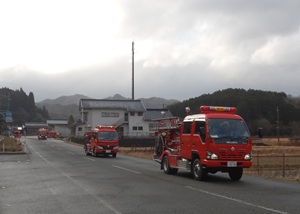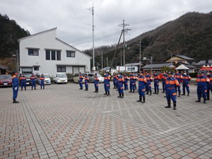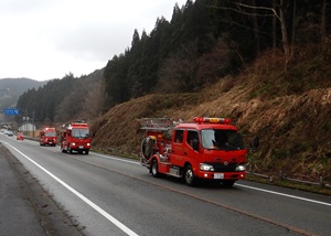 時折小雨が降る中、但東消防団の約30人の団員が本パレードに参加しました。出発地点の但東庁舎で団長から訓示を受けた団員らは、消防署但東駐在所の職員と共に、指揮車やポンプ自動車など8台に乗車し、山間の道路を中心に資母地区・高橋地区・合橋地区の順に巡回を実施しました。