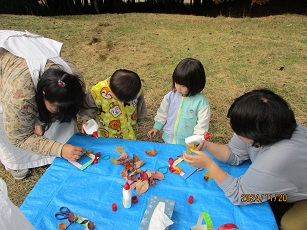 公園の遊具で戸外遊びをしたり、きれいな落ち葉やどんぐり、まつぼっくりを拾ったりして遊びましょう。