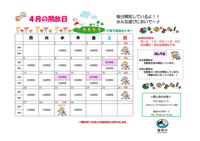 月曜日(1日)、土曜日(1日)、平日の午後の他に、以下の日の午前も開放しています。