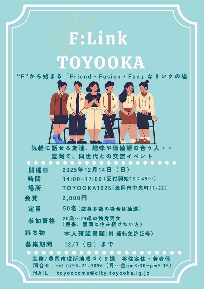 この「F:Link TOYOOKA」は、豊岡に暮らす・関わる20?29歳の独身男女が出会う特別な一日。