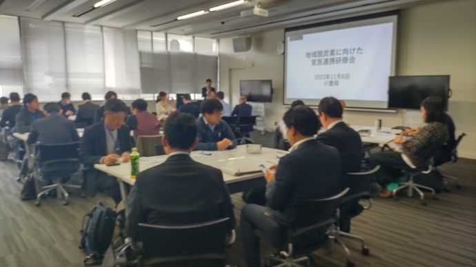 11月8日(水曜日)、地元企業や金融機関、自治体から40人が参加し、地域脱炭素を推進するため「地域脱炭素にむけた官民連携研修会」を豊岡市役所で開催しました。(環境省「令和5年度地域脱炭素実現に向けた中核人材の確保・育成委託業務」として開催)