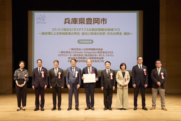 [画像]選定証授与式集合写真(222.6KB)(写真左から)株式会社ボーダレス・ジャパン 広報責任者 峯美紀子さん、株式会社カネカ 執行役員 PV & Energy management SV President 出口博之さん、一般社団法人日高神鍋観光協会 会長 岡藤泰明さん、環境省 環境大臣 石原宏高さん、副市長 土生田哉、環境省 環境副大臣 青山繁晴さん、一般社団法人Climate Integrate 代表理事 平田仁子さん、ハチドリソーラー株式会社 COO 川口康志さん、株式会社JTB 企画開発プロデュースセンター 企画開発担当部長 曽根 進さん