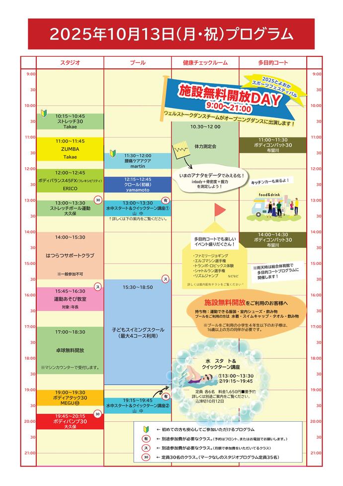 「無料開放DAY」では、誰でも施設(注)を利用することができます。