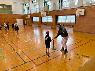 教室では、ティーボール用の柔らかいボールを使用して「ボールを投げること」「ボールを受けること」という野球の基本的な動きを体験しました。また、ボールに慣れてきたころにティーボールやトスバッティングを体験しました。