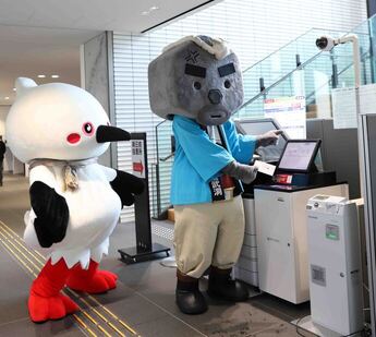 [画像]市役所本庁舎1階に設置の証明書発行機器て手続きする玄さんの写真(23.2KB)