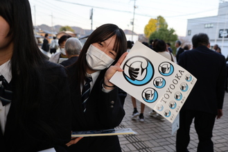 [画像]写真:ロゴマークのシール配布(高校生)(44.0KB)